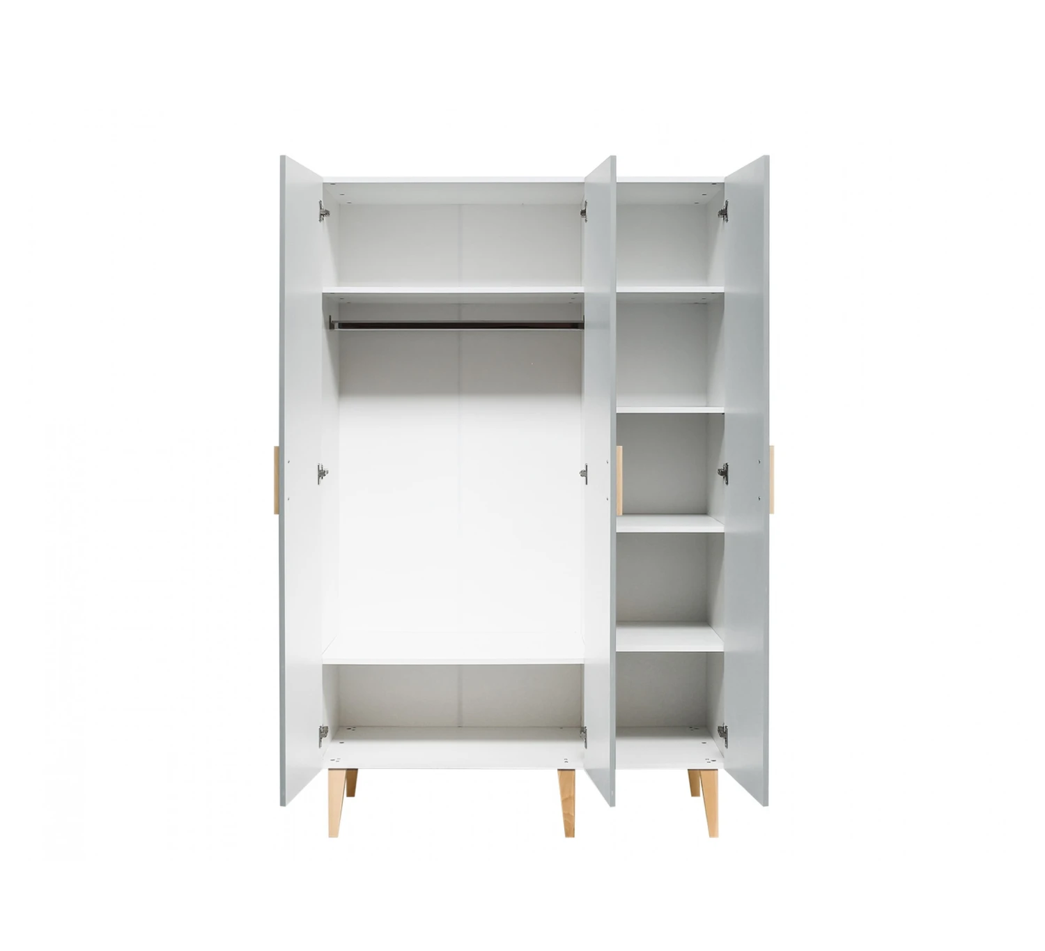 Als je veel plek nodig hebt voor al die leuke (baby)kleertjes, dan biedt de 3-deurskast Emma van Bopita de uitkomst. De kast is voorzien van ranke beukenhouten pootjes en subtiele grepen om de kast makkelijk mee te openen. Het interieur van de kast bestaat uit twee legplanken en een hangroede.