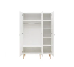 De 3-deurskast van de serie Indy is voorzien van lederen handgrepen. De ranke pootjes zijn utigevoerd in beukenhout. Afgewerkt met een lak op waterbasis, dat milieu- en kindvriendelijk is. Achter de linkse en middelste deuren bevinden zich twee legplanken en een hangroede. Achter de rechter deur geven de vier legplanken veel opbergmogelijkheden.