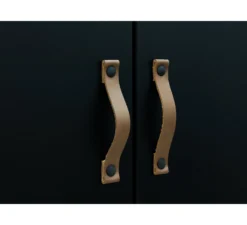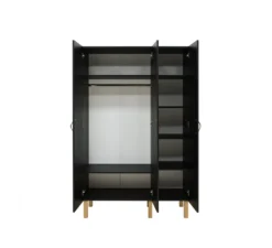 De 3-deurskast van de serie Floris is voorzien van leren handgrepen. De pootjes zijn uitgevoerd in beukenhout. De kast is afgewerkt met een lak op waterbasis die milieu- en kindvriendelijk is. Achter de linkse en middelste deuren bevinden zich twee legplanken en een hangroede. Achter de rechter deur geven de vier legplanken extra veel opbergmogelijkheden!