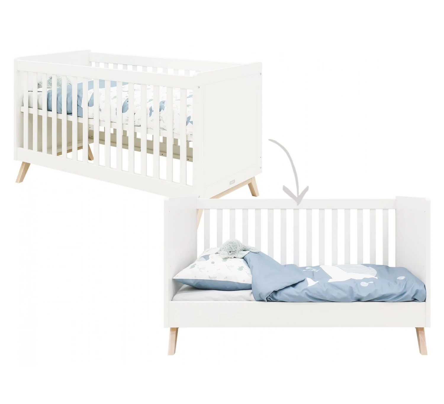 Dit babybed uit de serie Fenna van Bopita is om te bouwen van een ledikant met spijlen naar een peuter bedbank zodat de kleine zelf kan in- en uitstappen en hieraan kan wennen. Bedbodem, spijlenrek en lage zijde voor de bedbank worden standaard meegeleverd. De bodem van het spijlenbed is in hoogte verstelbaar. Omdat het bed in beide varianten 70×140 cm meet, heb je genoeg aan ƩƩn matras. Doordat het bed om te bouwen is, heb je extra lang plezier van dit bed.