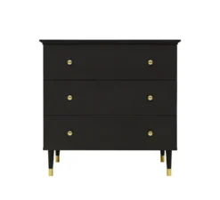 De commode uit de serie Cloƫ heeft drie ruime lades om al je kleding en spulletjes goed op te kunnen bergen. De commode staat op ranke poten met gouden accenten. Deze gouden accenten komen ook terug in de handgrepen van de lades. De combinatie van de gouden accenten en de mat zwarte afwerking geeft de serie Cloƫ een warme luxe uitstraling. Je kunt deze commode ook combineren met het bijpassende wandrek Cloƫ en uitbreiden met de barrier Uno. Met de barrier kun je het blad vergroten, zodat je je kindje veilig kunt verschonen.