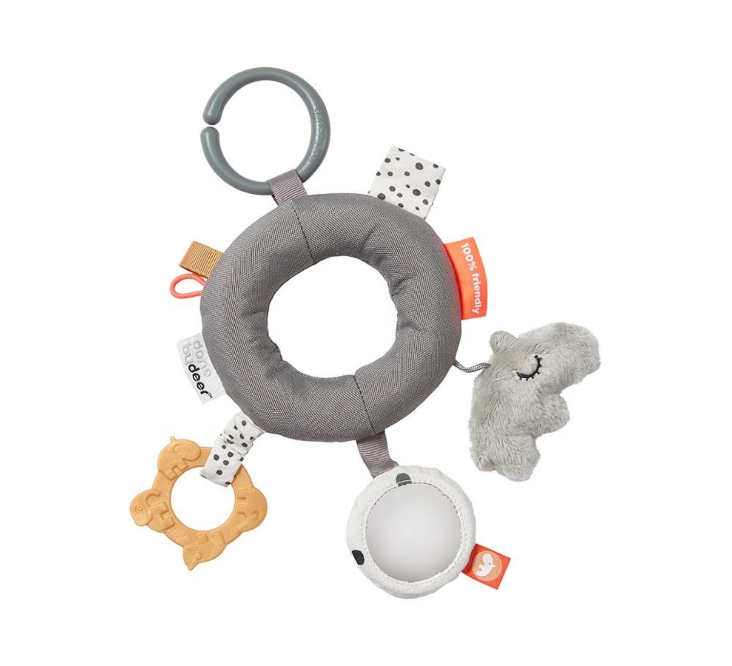 Deze bijtring van Done by Deer is voorzien van allerlei kleine speeltjes waar je kindje heerlijk mee kan spelen en experimenteren. De verschillende materialen, texturen en knispergeluidjes laten je kindje kennis maken met deze dingen. Dankzij de ring kan de bijtring gemakkelijk aan een speelkleed, autostoeltje, box of kinderwagen worden vastgemaakt.