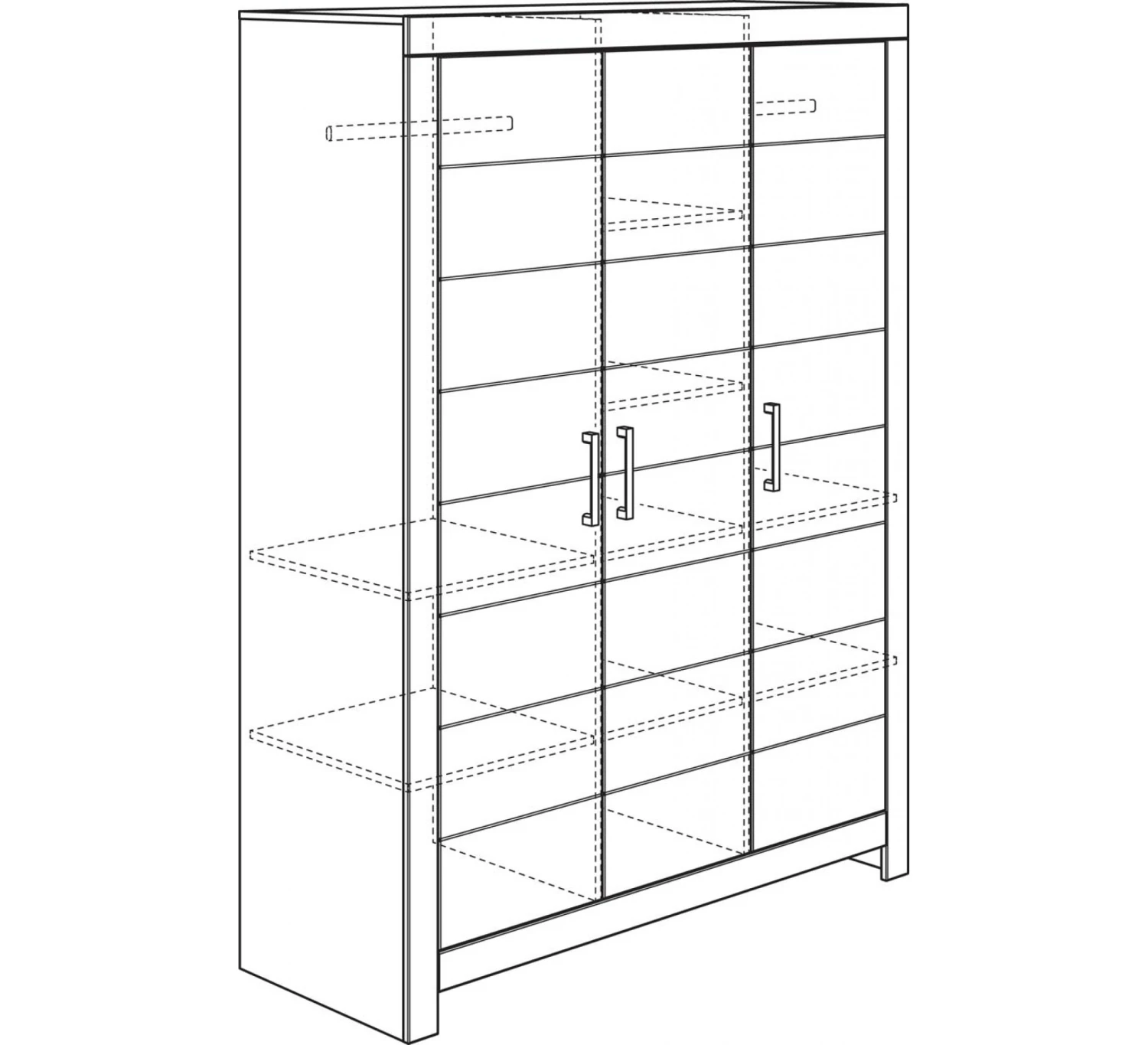 3-deurs kast uit de Paidi Fiona collectie. De kast is voorzien van 2 tussenwanden, 2 roedes, 4 grote legborden en 4 kleine legborden. De kast kan geleverd worden met mat chromen en glanzend chromen handgrepen. Afmetingen: Breedte: 157 cm Hoogte: 205 cm Diepte: 55 cm