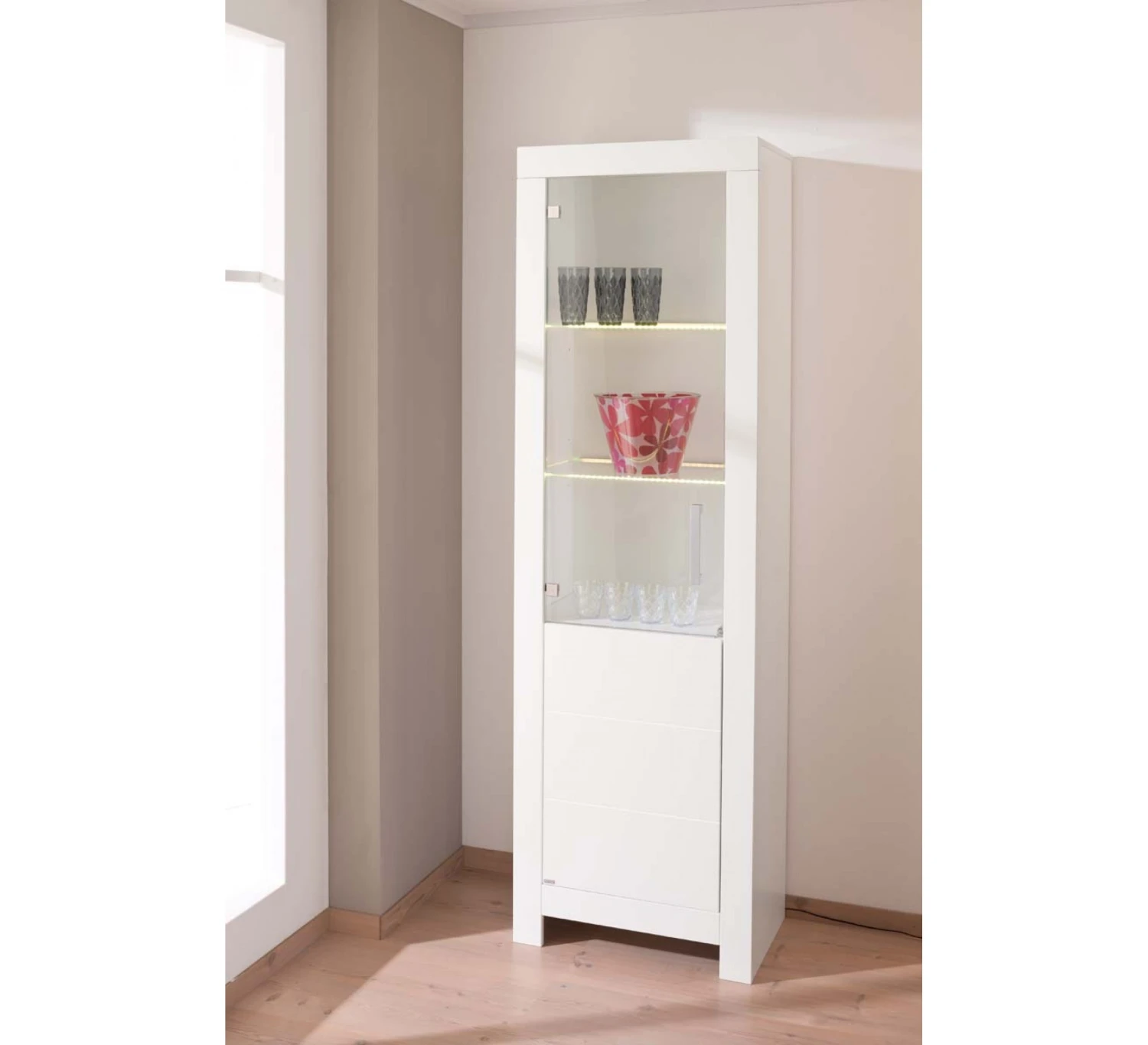 Vitrinekast Fiona voorzien van een glazen deur, 2 legborden met verlichting, 1 houten deur met push to open functie en een inlegelement. Deze versie is voorzien van mat chromen handgrepen. Afmetingen: Breedte: 63 cm Hoogte: 205 cm Diepte: 39 cm