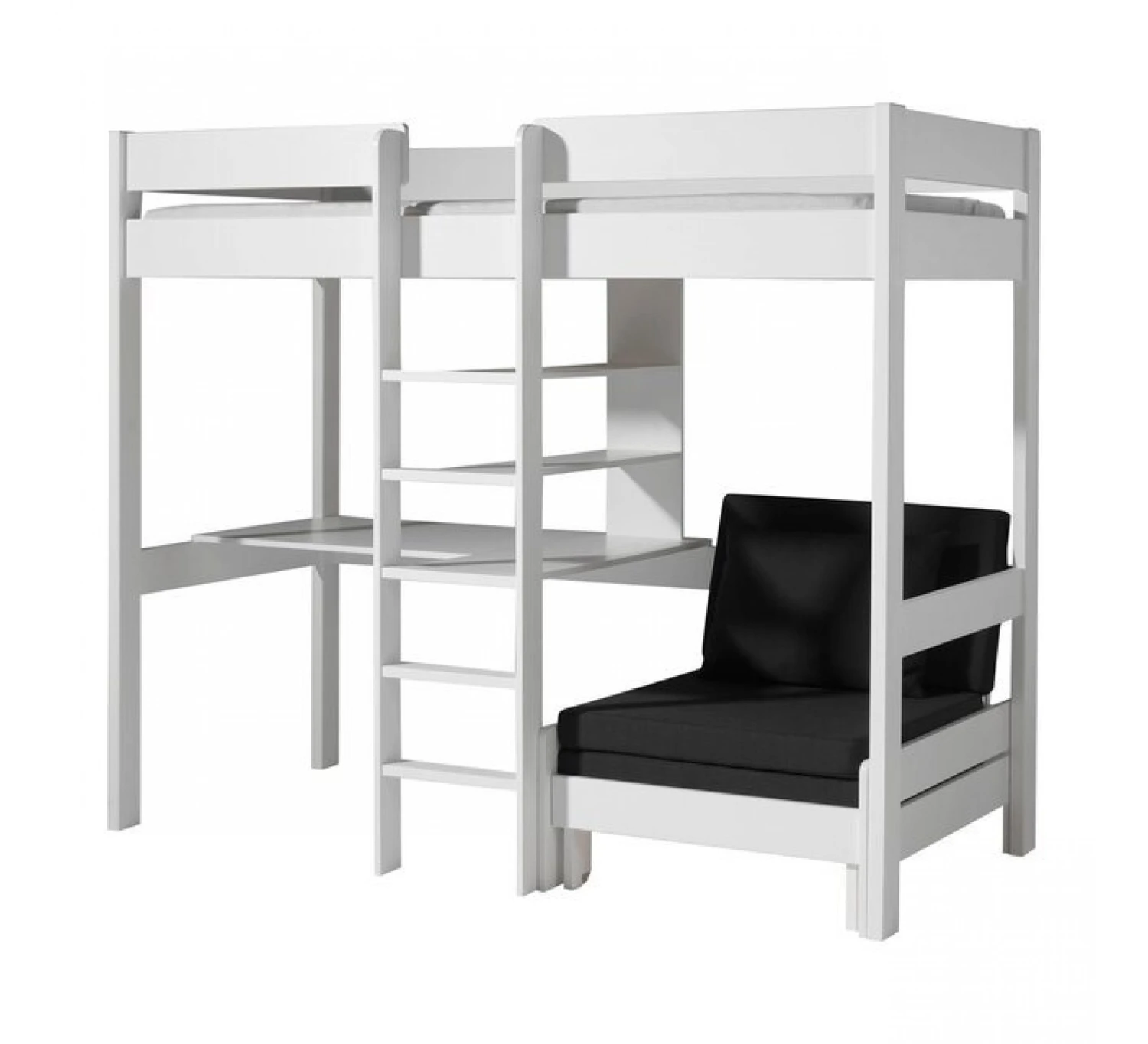 De hoogslaper is compleet met bureau, 2 legplanken en een sofabed.