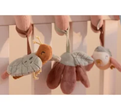 De boxspiraal is makkelijk te bevestigen aan een box, bedje of de beugel van de kinderwagen. De activiteitenspiraal is gemaakt van corduroy met katoen en draait om een klein vogeltje, een kleurrijke vlinder en een fascinerende bloem die een ratelend geluid maakt.