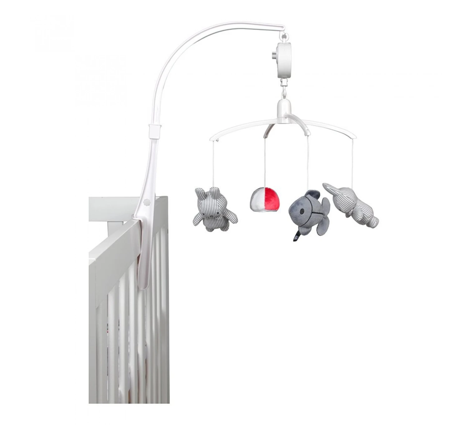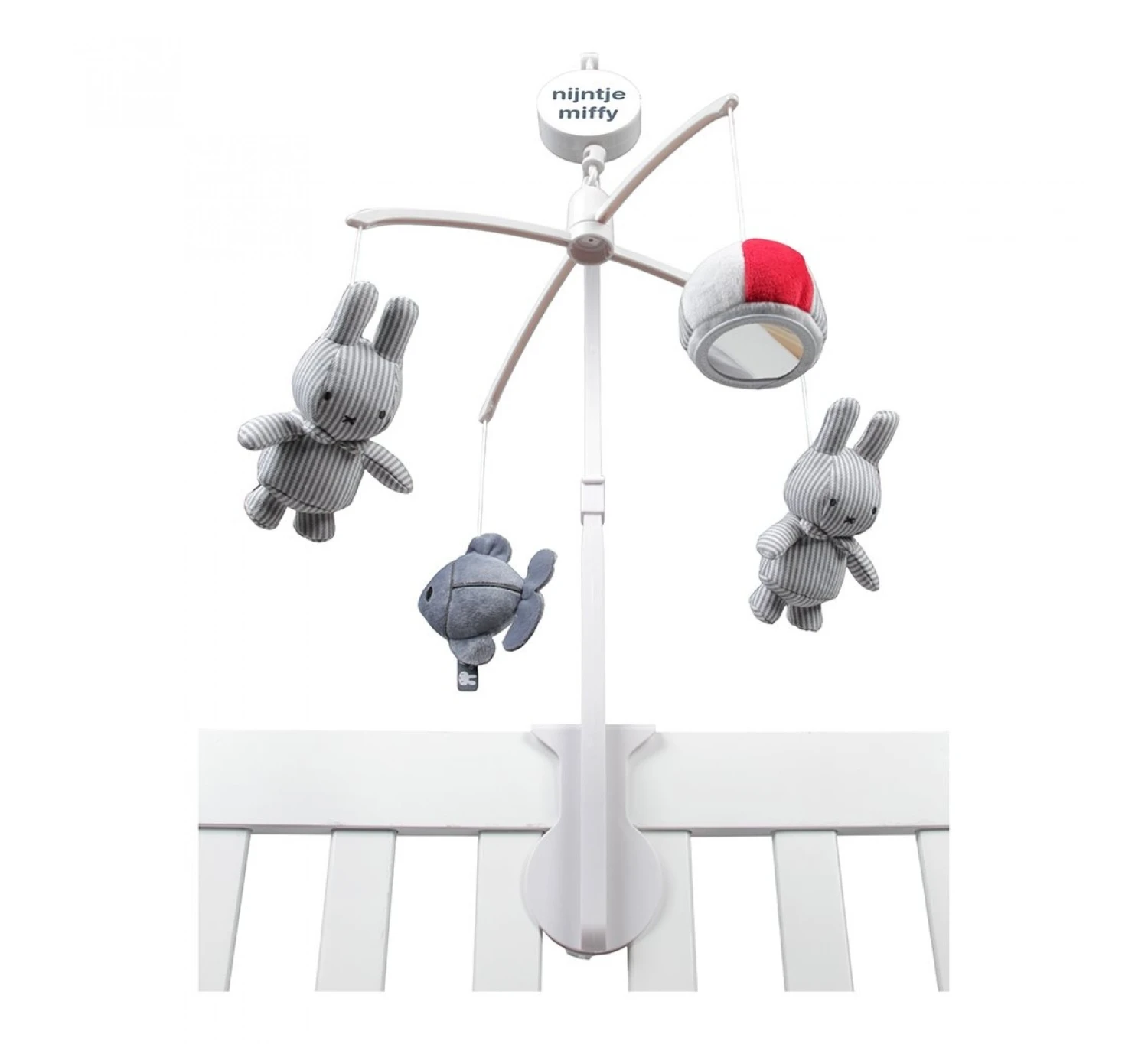 De muziekmobiel van Nijntje is eenvoudig te bevestigen aan de box. Het heeft ƩƩn melodie: Brahms Lullaby. Aan de mobiel hangen vier speeltjes: twee konijntjes, een balletje met spiegel en visje. Een muziekmobiel werkt rustgevend voor de baby en leert je kleintje om te leren kijken en volgen.