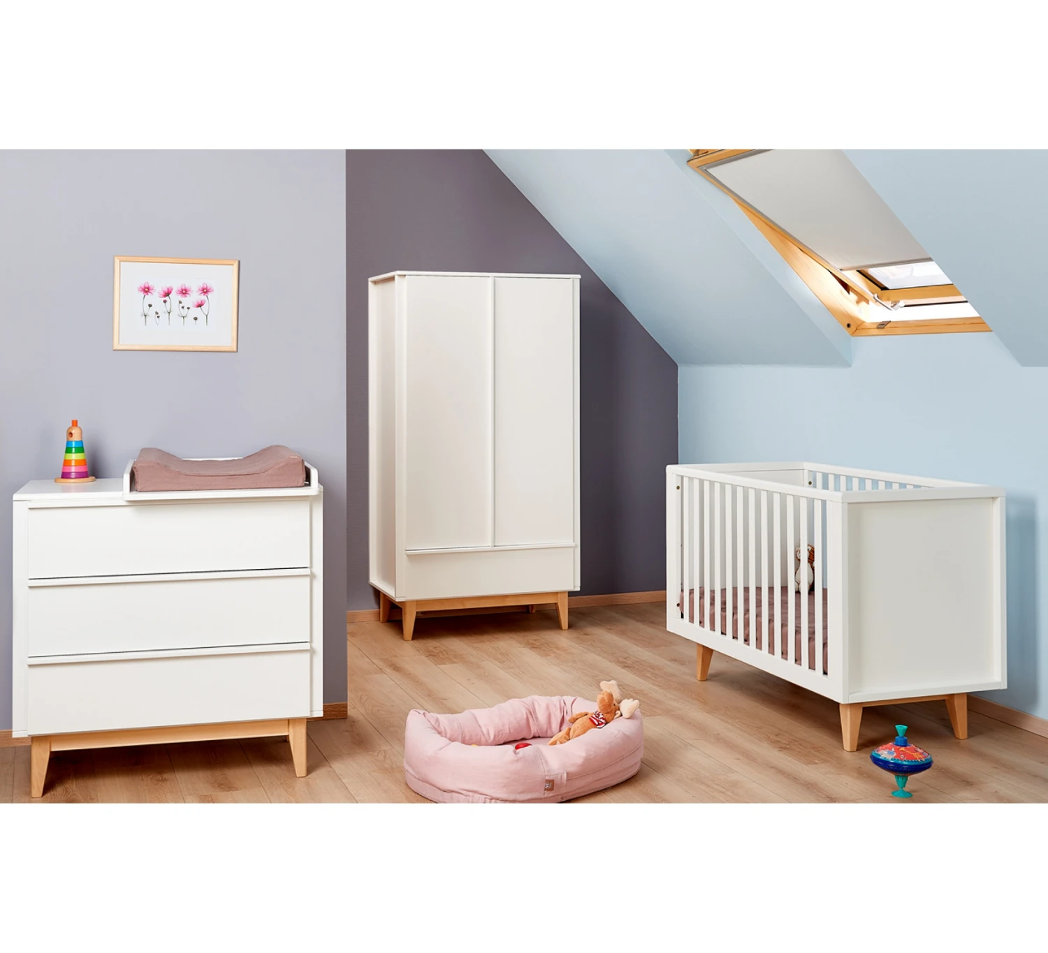 Het dressoir met mooie, rechte lijnen heeft drie diepe lades met een glad front. In plaats van grepen loopt een houten rand langs de bovenzijde van de lades. Terugkerend voor Scandy zijn de mooi gesneden poten in berken die zijn behandeld met ongekleurde natuurlijke was voor de beste duurzaamheid. De barrier kan er gemakkelijk af als de peuterperiode voorbij is. Het dressoir wordt vervolgens omgetoverd tot een stijlvolle eenheid die geschikt is voor zowel kinderen als volwassenen.